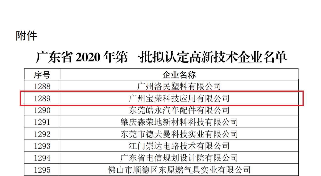 喜报!博宏子公司宝荣科技入选广东省2020年第一批拟认定高新技术企业名单