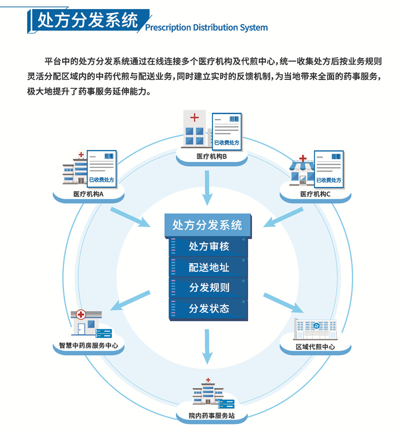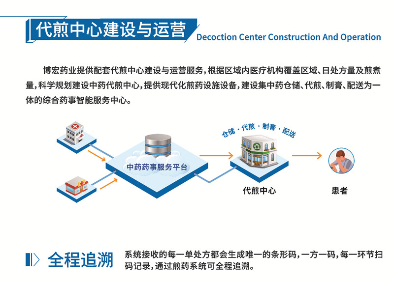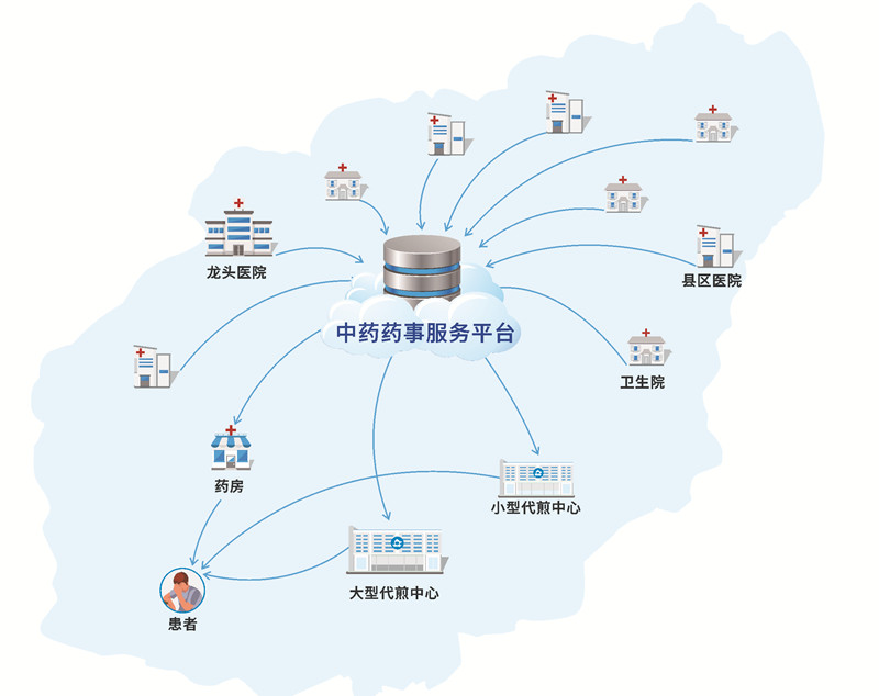 中药代煎共享平台是药事服务平台其中重要部分,是设置有现代化煎药设施设备,集中药仓储、代煎、制膏、配送为一体的综合药事智能服务中心,面向社会各大医疗机构及广大患者提供安全、高效、便捷、优质的药事服务。中药代煎共享平台已快速在各地区铺开投入运营,未来将逐步覆盖全国,组成中药代煎共享服务网链。